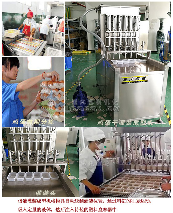 蛋液經(jīng)過攪拌之后就進(jìn)入了定型程序,蛋液灌裝成型機(jī)將模具自動送到灌裝位置,蛋液灌裝機(jī)的計量缸分別連接灌裝頭,通過料缸的往復(fù)運(yùn)動,吸入定量的液體,然后注入待裝的塑料盒容器中;整機(jī)采用全不銹鋼產(chǎn)品制成,拆裝簡單,易清洗,符合食品衛(wèi)生要求,氣動定量灌裝,六個灌裝嘴同時出料,結(jié)構(gòu)合理,操作方便,易于維護(hù),維修,便于清洗;雞蛋干蛋液灌裝成型機(jī)已成為雞蛋干生產(chǎn)線中必不可少的灌裝設(shè)備;雞蛋干灌裝成型后,然后鹵制,較后經(jīng)過真空包裝機(jī)包裝,成品基本上就完成啦