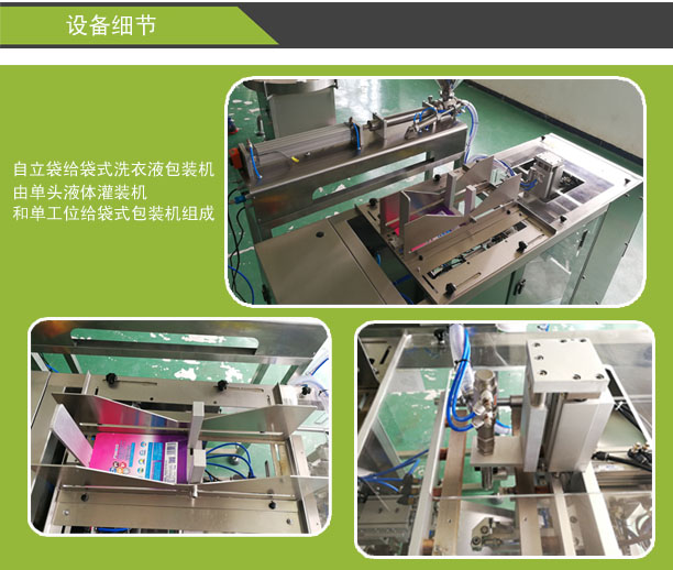 全自動(dòng)自立袋洗衣液灌裝機(jī)是星火新研發(fā)的一款產(chǎn)品,上袋、定量灌裝、封合、切膜、自動(dòng)計(jì)數(shù)一次性自動(dòng)完成,工藝流程部位采用不銹鋼制造,包裝袋熱合、送袋長(zhǎng)度、包裝重量、加熱溫度的調(diào)整,簡(jiǎn)便可靠,連續(xù)灌裝精度高,包裝速度快,維修方便,是用戶致富選擇的理想設(shè)備。包裝產(chǎn)品美觀牢靠,外殼、管道、定量泵采用不銹鋼結(jié)構(gòu),確保衛(wèi)生,符合食品衛(wèi)生的要求