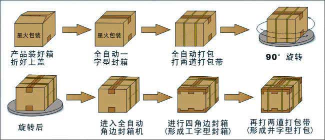本包裝生產(chǎn)流水線主要操作流程:已裝好產(chǎn)品折好上蓋的產(chǎn)品箱從左邊的滾筒進入此流水線,進入第1臺包裝機械:全自動一字型封箱機(進行一字型封箱)—→進入第二臺包裝機械:全自動打包機(打兩道打包帶)—→進入第三臺包裝機械:90°旋轉機—→進入第四臺包裝機械:全自動角邊封箱機(進入四角邊封箱,形成工字型封箱)—→進入較后的第五臺包裝機械:全自動打包機(打另外兩道的打包帶,形成井字形打包)—→工字型封箱+井字型打包完成。